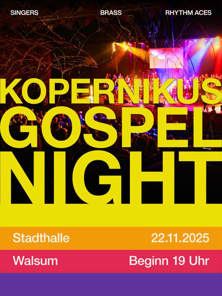 Singers – Brass – Rhythm Aces Kopernikus Gospel Facebook Instagram TikTok YouTube Mail Kopernikus Gospel Night 2025 22.11.2025 | 19 Uhr Stadthalle Duisburg Walsum, Waldstr. 50, 47179 DuisburgEinlass: 18 UhrKarten können Samstags 9-13 am Hintereingang der Stadthalle Walsum oder bei allen Beteiligten erworben werden.